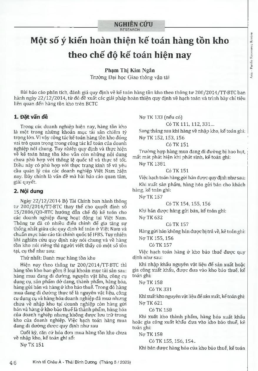 Một số ý kiến hoàn thiện kế toán hàng tồn kho theo chế độ kế toán hiện nay