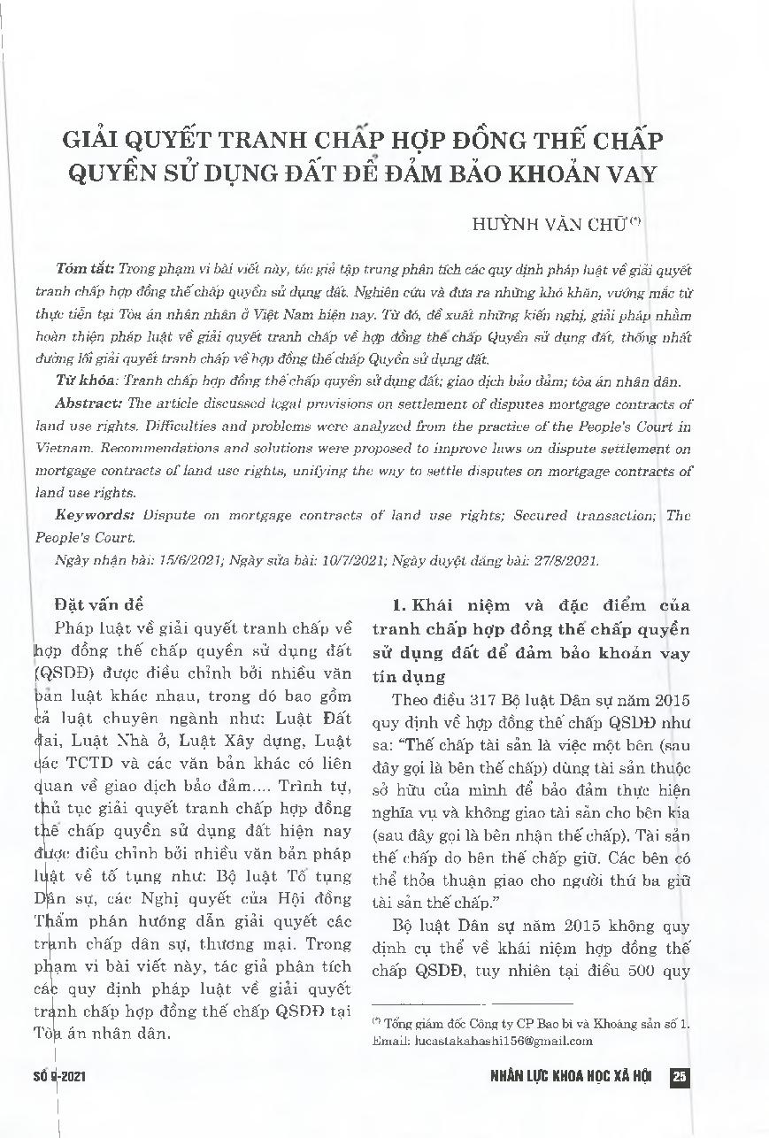 Giải quyết tranh chấp hợp đồng thế chấp quyền sử dụng đất để đảm bảo khoản vay = Settlement of land use right mortgage contract disputes to secure loans