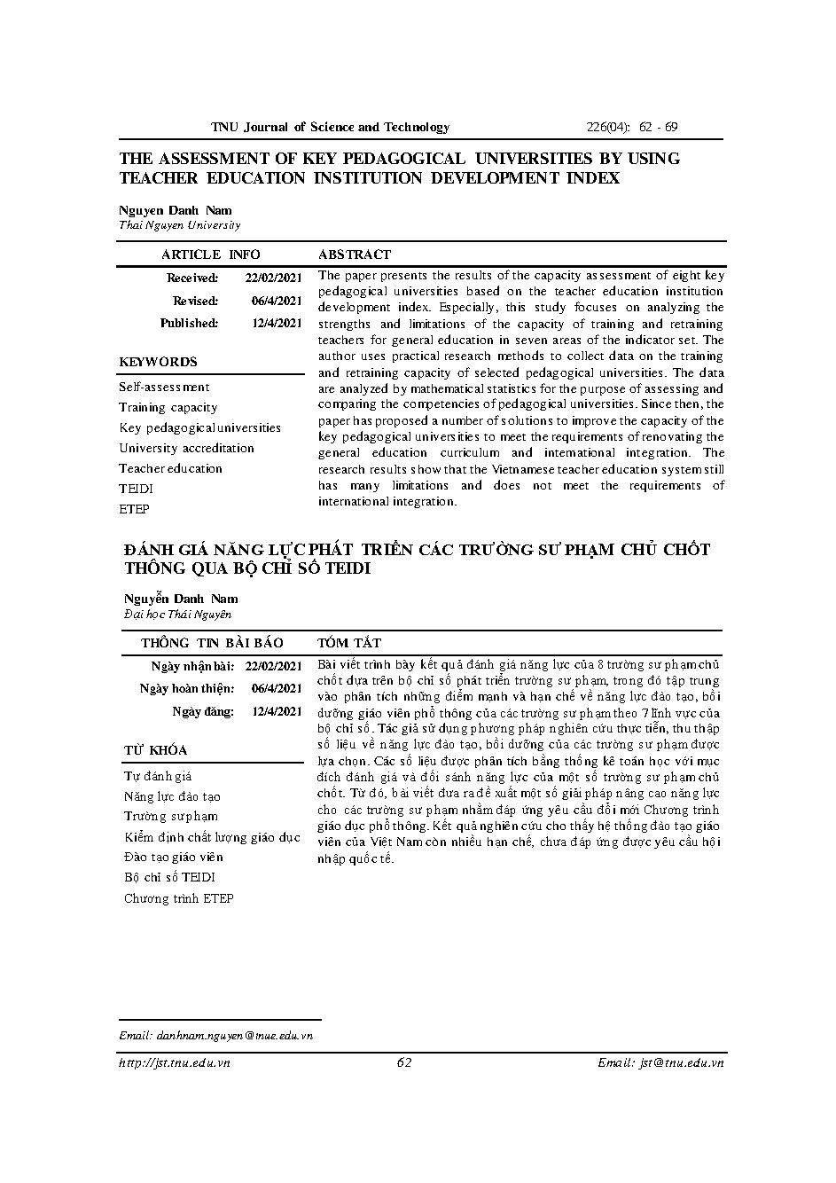 Đánh giá năng lực phát triển các trường sư phạm chủ chốt thông qua bộ chỉ số teidi = The assessment of key pedagogical universities by using teacher education institution development index