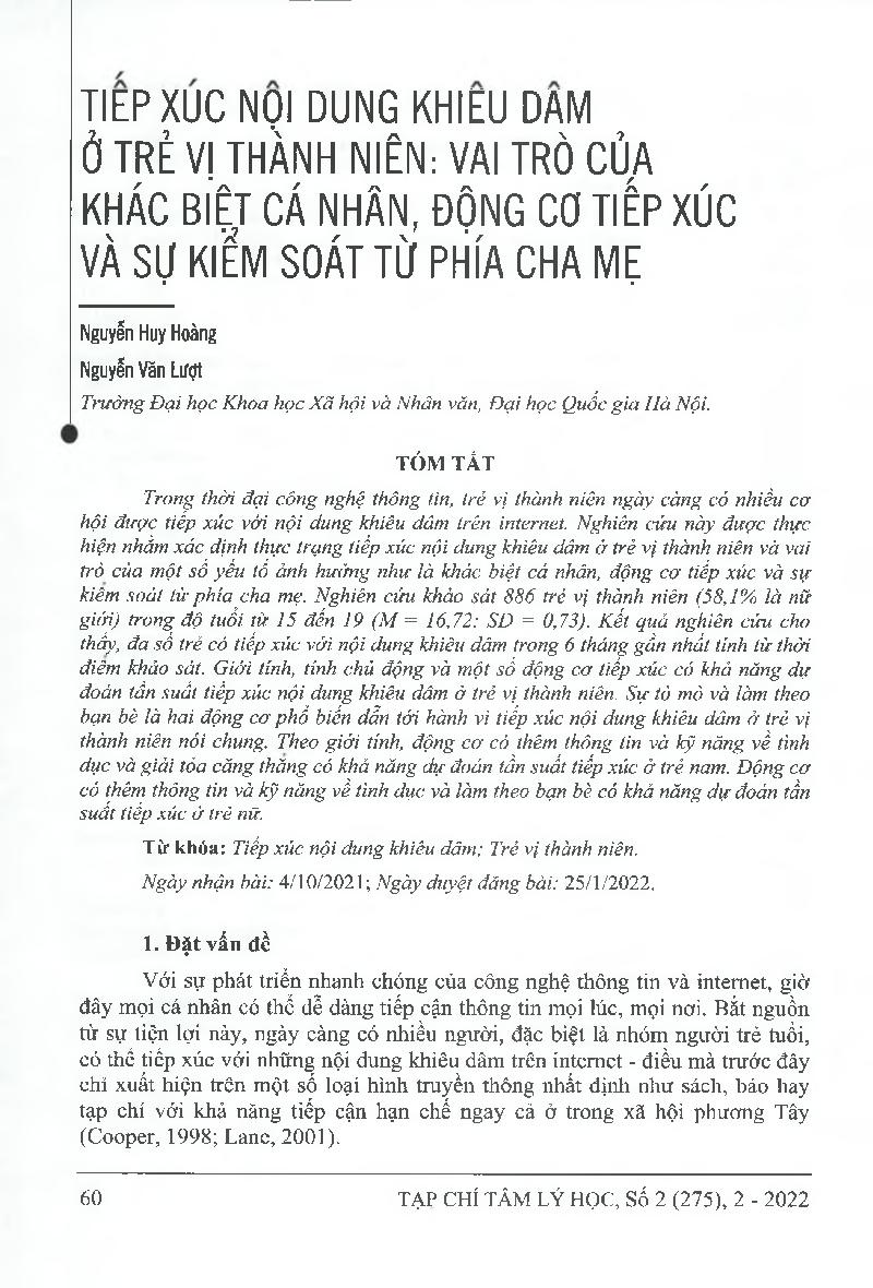Tiếp xúc nội dung khiêu dâm 7 ở trẻ vị thành niên: vai trò của khác biệt cá nhân, động cơ tiếp xúc và sự kiểm soát từ phía cha mẹ = Adolescents&; 39; pornography exposure: individual discrepancies, motives, and parentalmonitoring