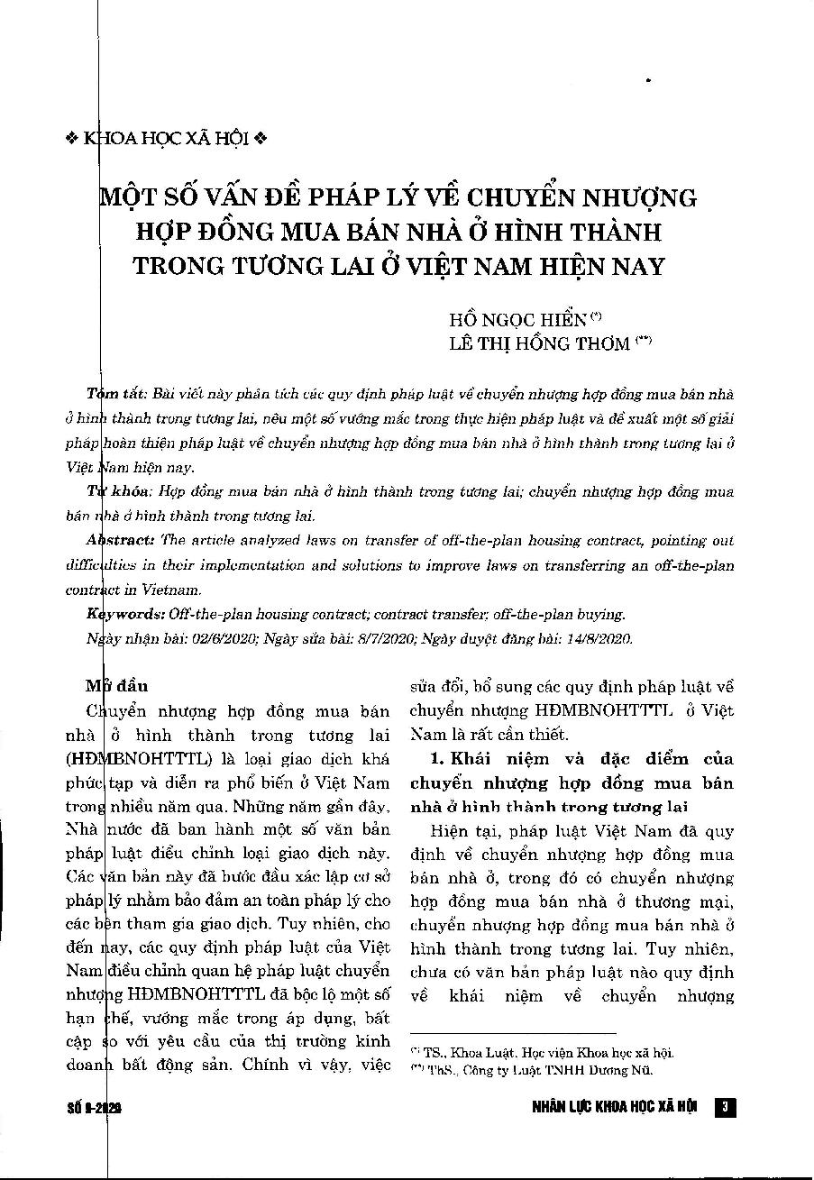 Một số vấn đề pháp lý về chuyển nhượng hợp đồng mua bán nhà ở hình thành trong tương lai ở Việt Nam hiện nay = Legal issues on the transfer of off-the-plan housing contract in Vietnam