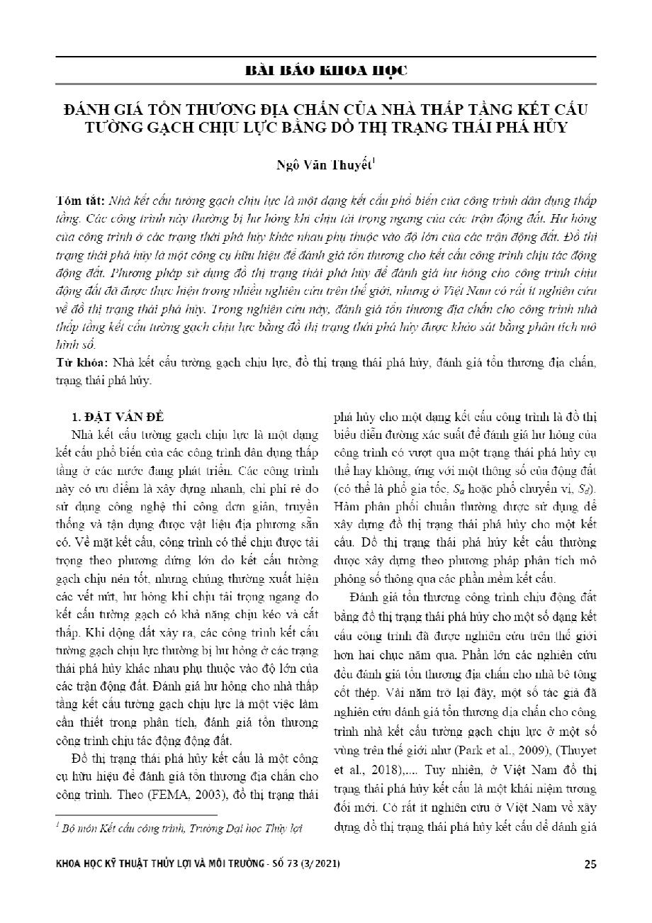 Đánh giá tổn thương địa chấn của nhà thấp tầng kết cấu tường gạch chịu lực bằng đồ thị trạng thái phá hủy = Seismic vulnerability assessment of a low-rise un-reinforced masonry building by fragility curves