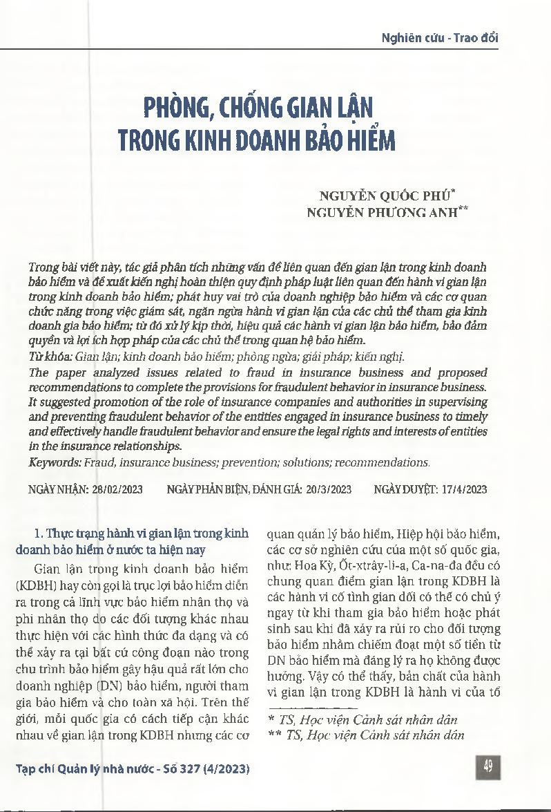 Phòng, chống gian lận trong kinh doanh bảo hiểm = Preventing and combating fraud in insurance business