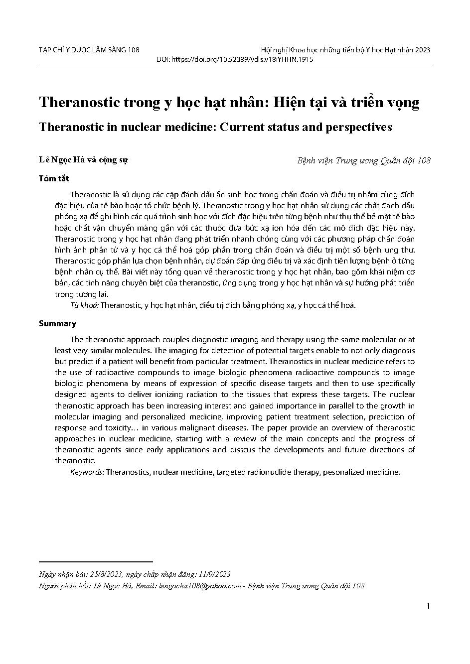 Theranostic trong y học hạt nhân: Hiện tại và triển vọng = Theranostic in nuclear medicine: Current status and perspectives
