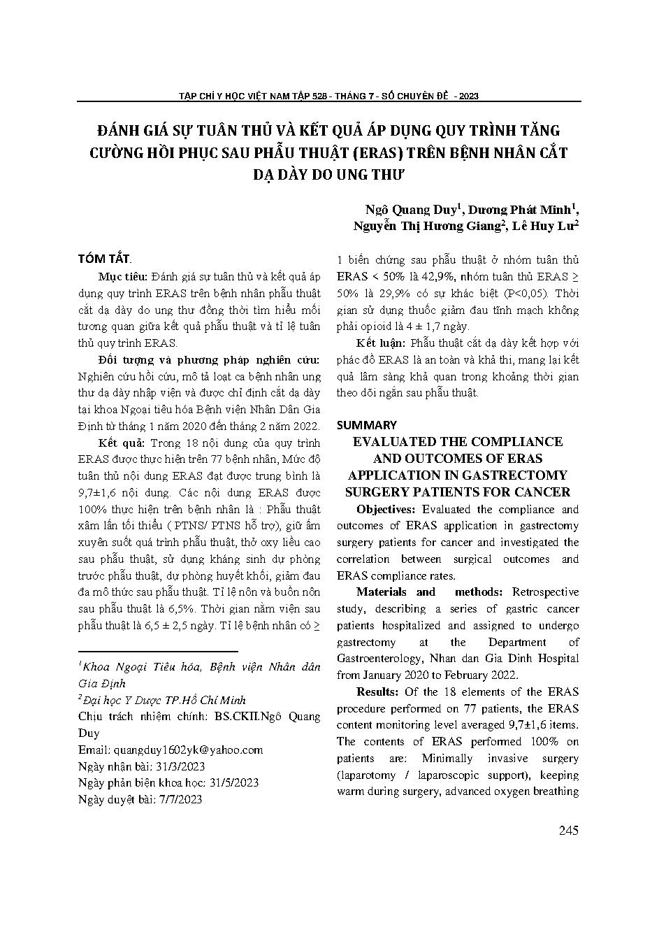 Đánh giá sự tuân thủ và kết quả áp dụng quy trình tăng cường hồi phục sau phẫu thuật (ERAS) trên bệnh nhân cắt dạ dày do ung thư