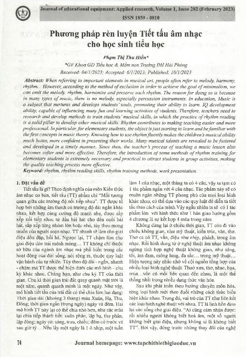 Phương pháp rèn luyện Tiết tấu âm nhạc cho học sinh tiểu học = Methods of practicing Musical Rhythm for primary school students.