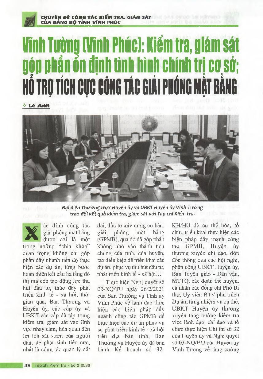 Vĩnh Tường (Vĩnh Phúc) kiểm tra, giám sát góp phán ổn định tình hình chính trị cơ sở; hỗ trợ tích cực công tác giải phóng mặt bằng