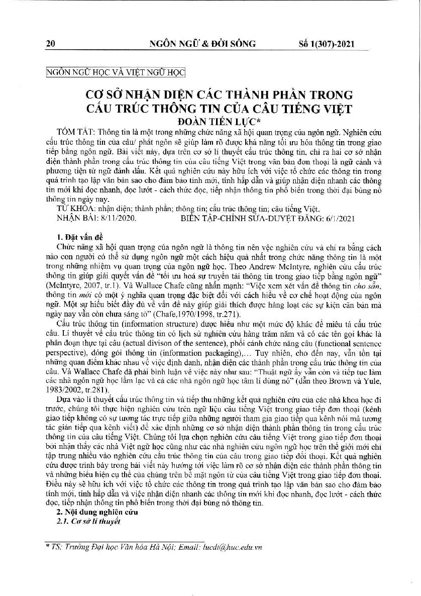 Cơ sơ nhận diện các thành phần trong cấu trúc thông tin của câu tiếng Việt