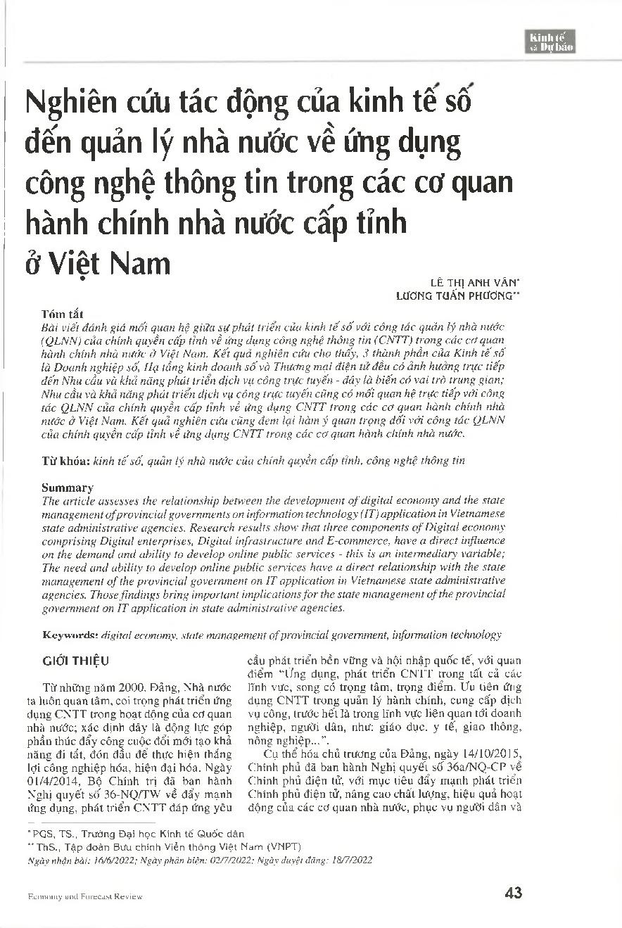 Nghiên cứu tác động của kinh tế số đến quản lý nhà nước về ứng dụng công nghệ thông tin trong các cơ quan hành chính nhà nước cấp tỉnh ở Việt Nam = A study on the impact of digital economy on state management of information technology application in provi