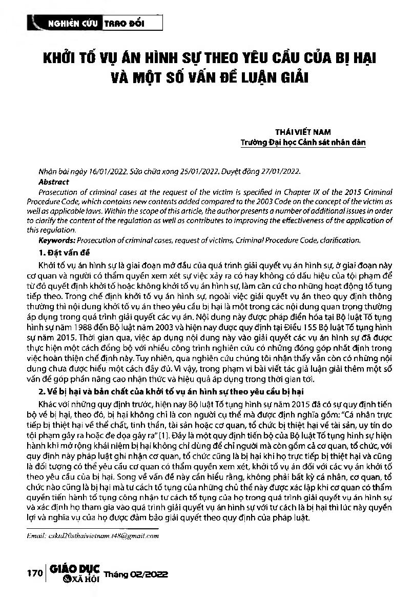 Khởi tố vụ án hình sự theo yêu cầu của bị hại và một số vấn đề luận giải = Prosecution of criminal cases at the request of the victims and a number of issues of interpretation