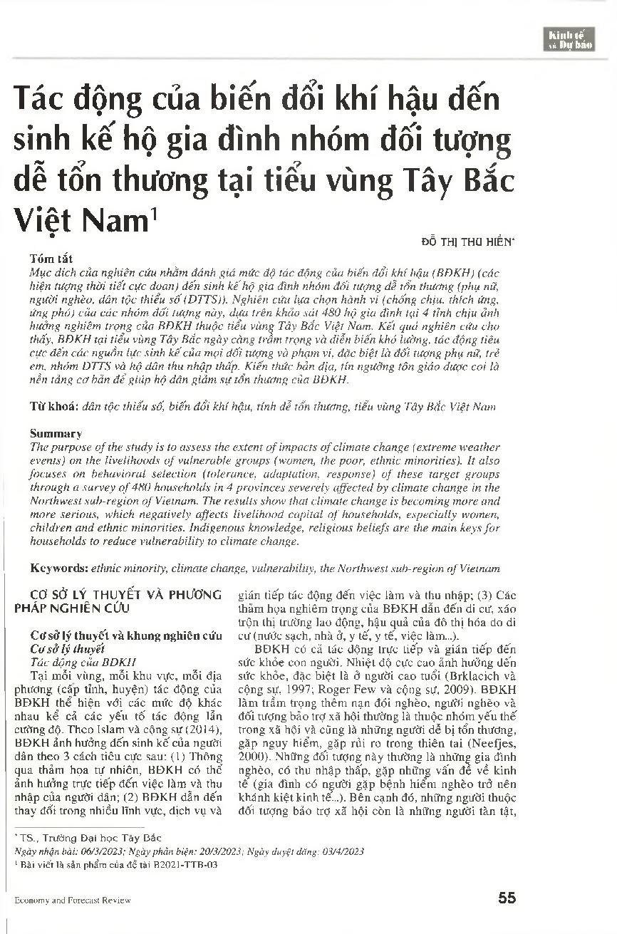 Tác động của biến đổi khí hậu đến sinh kế hộ gia đình nhóm đối tượng dễ tổn thương tại tiểu vùng Tây Bắc Việt Nam
