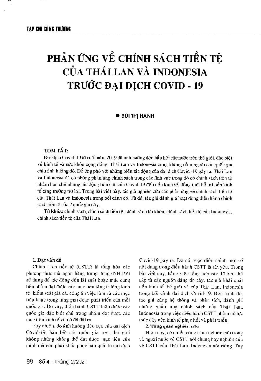Phản ứng về chính sách tiền tệ của Thái Lan và Indonesia trước đại dịch Covid - 19 = Thailand and Indonesia's monetary policy responses to the Covid-19 pandemic