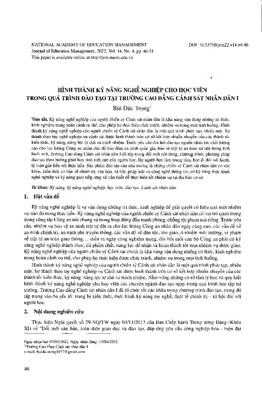 Hình thành kỹ năng nghề nghiệp cho học viên trong quá trình đào tạo tại Trường Cao đẳng Cảnh sát nhân dân I = Formulation of professional skills for students in the training process at People’s Police College I