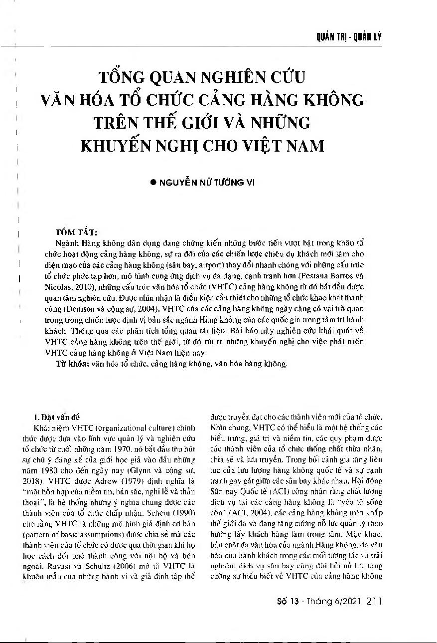 Tổng quan nghiên cứu văn hóa tổ chức cảng hàng không trên thế giới và những khuyến nghị cho Việt Nam = An overview about airport organization culture in the world and recommendations for Vietnam