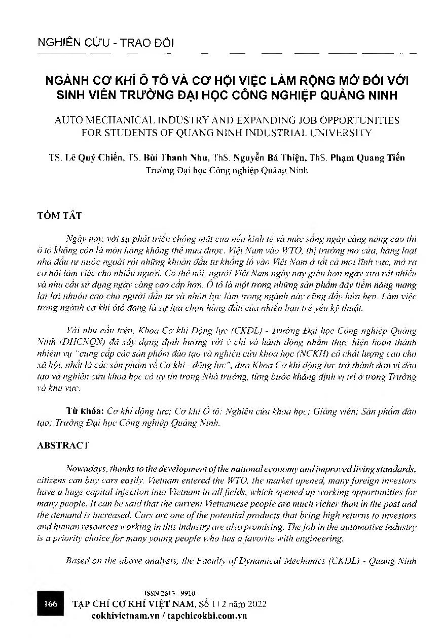 Ngành cơ khí ô tô và cơ hội việc làm rộng mở đối với sinh viên Trường Đại học Công nghiệp Quảng Ninh = Auto mechanical industry and expanding job opportunities for students of quang ninh industrial university