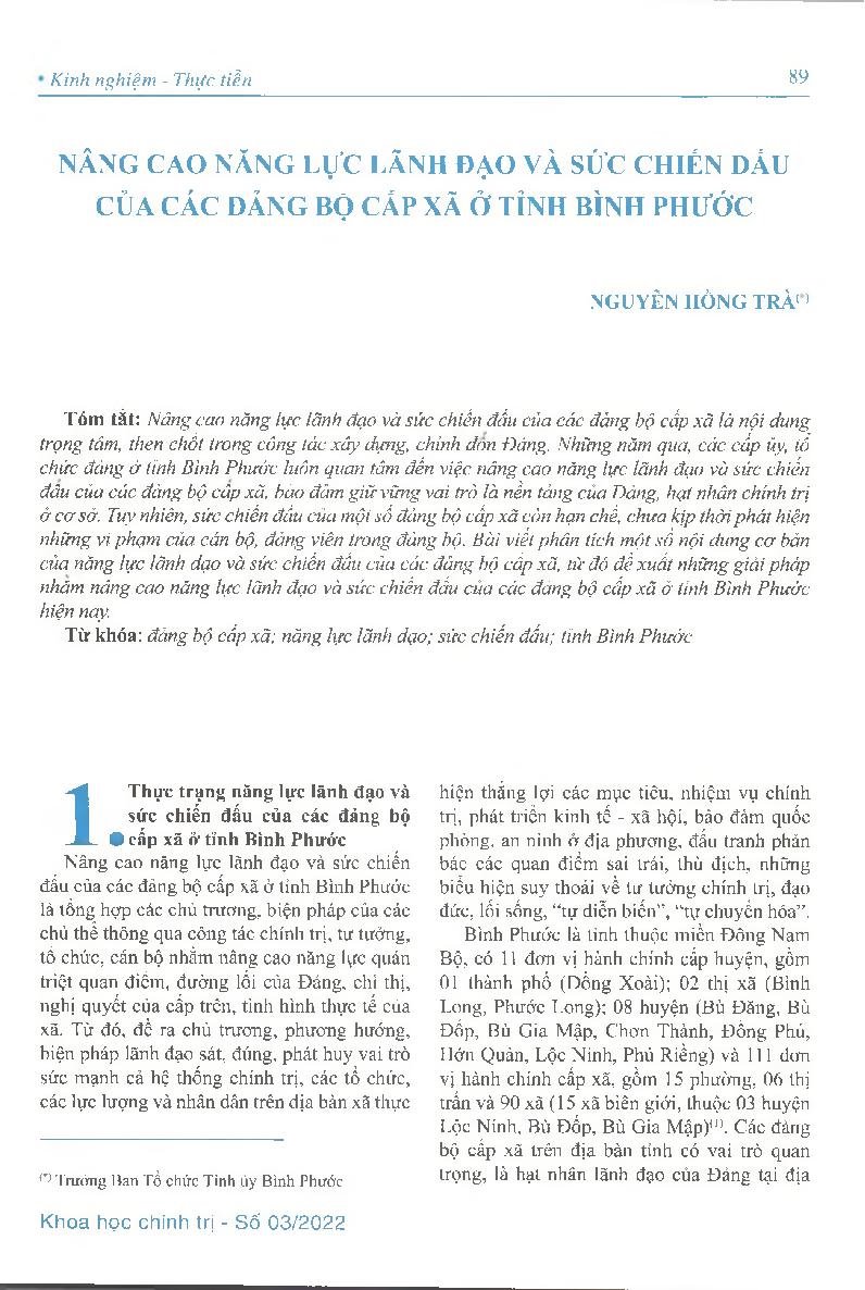 Nâng cao năng lực lãnh đạo và sức chiến đấu của các đảng bộ cấp xã ở tỉnh Bình Phước = Improving leadership capacity and fighting strength of commune-level party committees in Binh Phuoc province