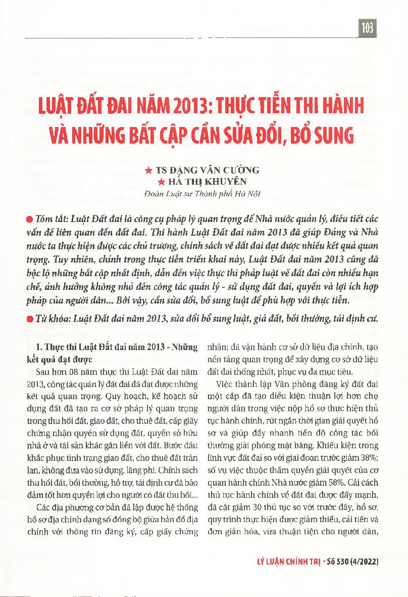 Luật Đất đai năm 2013: Thực tiễn thi hành và những bất cập cần sửa đổi, bổ sung = Land Law 2013: Practical implementation and shortcomings that need to be amended and supplemented