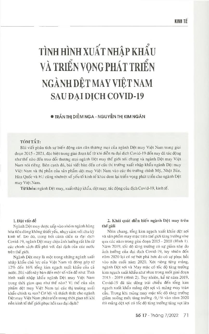 Tình hình xuất nhập khẩu và triển vọng phát triển ngành dệt may Việt Nam sau đại dịch Covid-19 = The import - export and development prospects of Vietnam&; 39;s textile and garment industry after the COVID-19 pandemic
