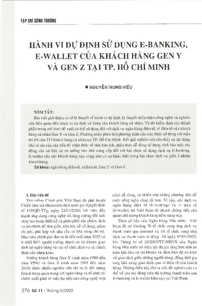 Hành vi dự định sử dụng E-Banking, E-Wallet của khách hàng Gen Y và Gen Z tại TP. Hồ Chí Minh = The intention of Gen Y and Gen z customers for using e-wallet and e-banking services in Ho Chi Minh City