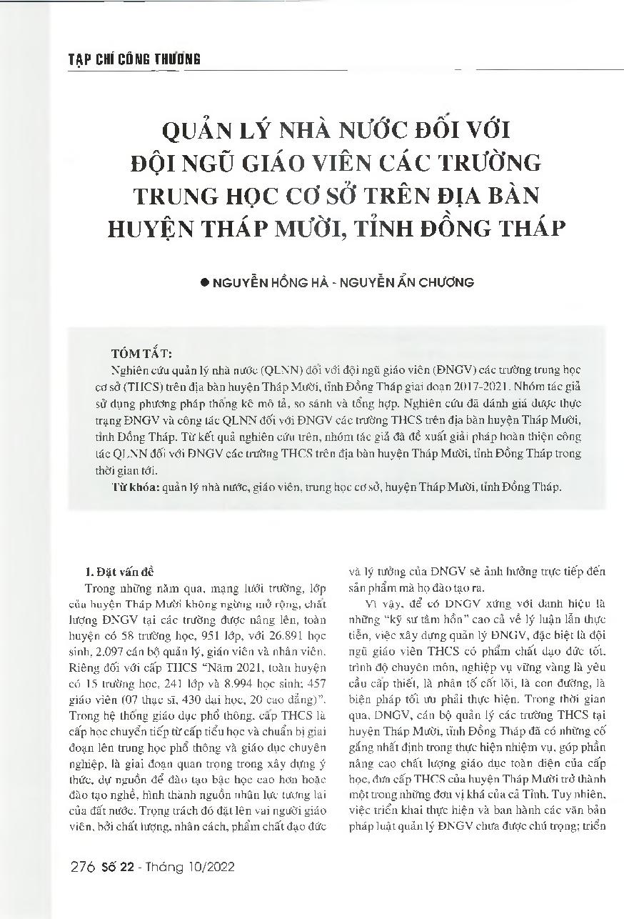 Quản lý nhà nước đối với đội ngũ giáo viên các trường trung học cơ sở trên địa bàn huyện Tháp Mười, tỉnh Đồng Tháp = The state management for junior high school teachers in Thap Muoi district, Dong Thap province