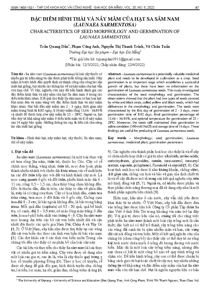 Đặc điểm hình thái và nảy mầm của hạt sa sâm nam (launaea sarmentosa) = Characteristics of seed morphology and germination of launaea sarmentosa