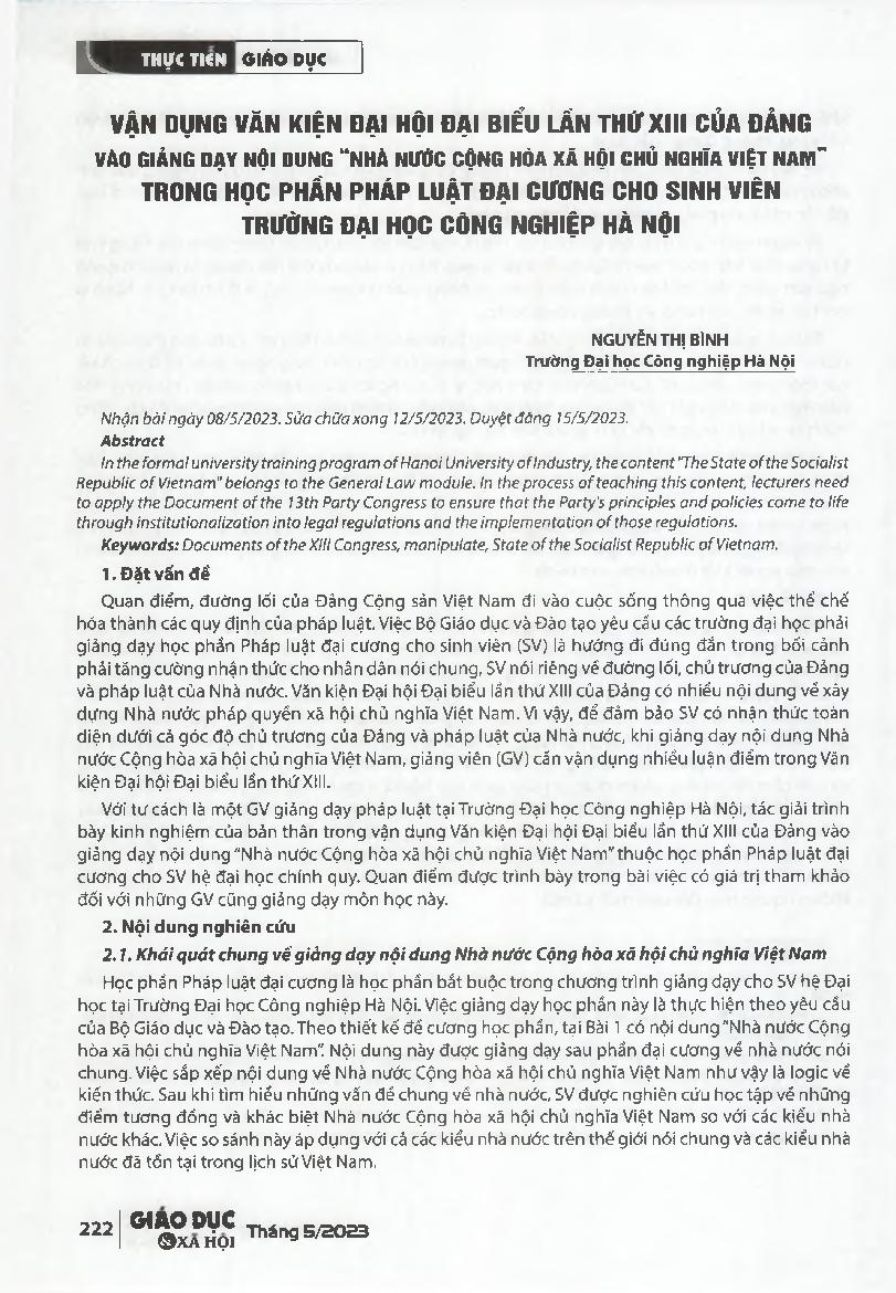 Vận dụng Văn kiện Đại hội Đại biểu lán thứ XIII của Đảng vào giảng dạy nội dung "Nhà nước cộng hòa xã hội chủ nghĩa Việt Nam" trong học phẩn Pháp luật đại cương cho sinh viên Trường Đại học Công nghiệp Hà Nội = Applying the Document of the 13th Party Cong