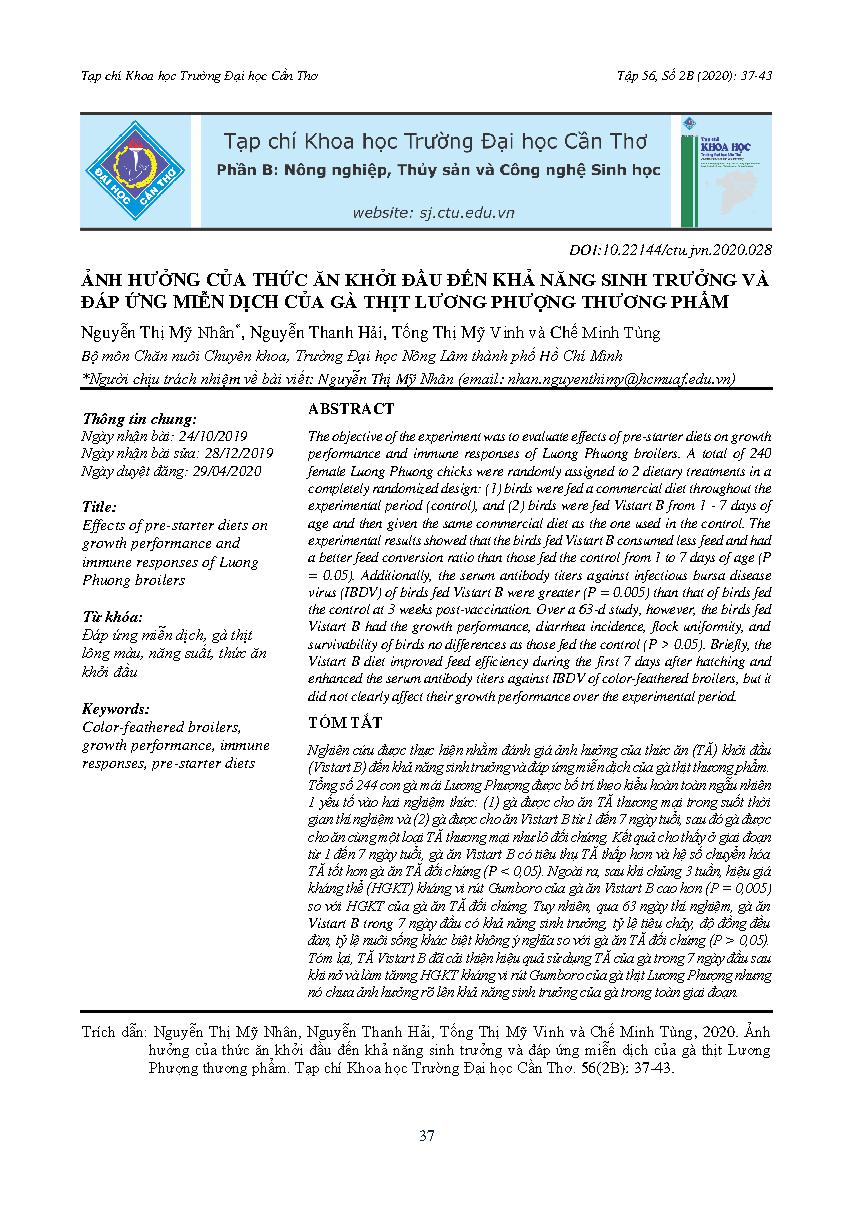 Ảnh hưởng của thức ăn khởi đầu đến khả năng sinh trưởng và đáp ứng miễn dịch của gà thịt Lương Phượng thương phẩm = Effects of pre-starter diets on growth performance and immune responses of Luong Phuong broilers