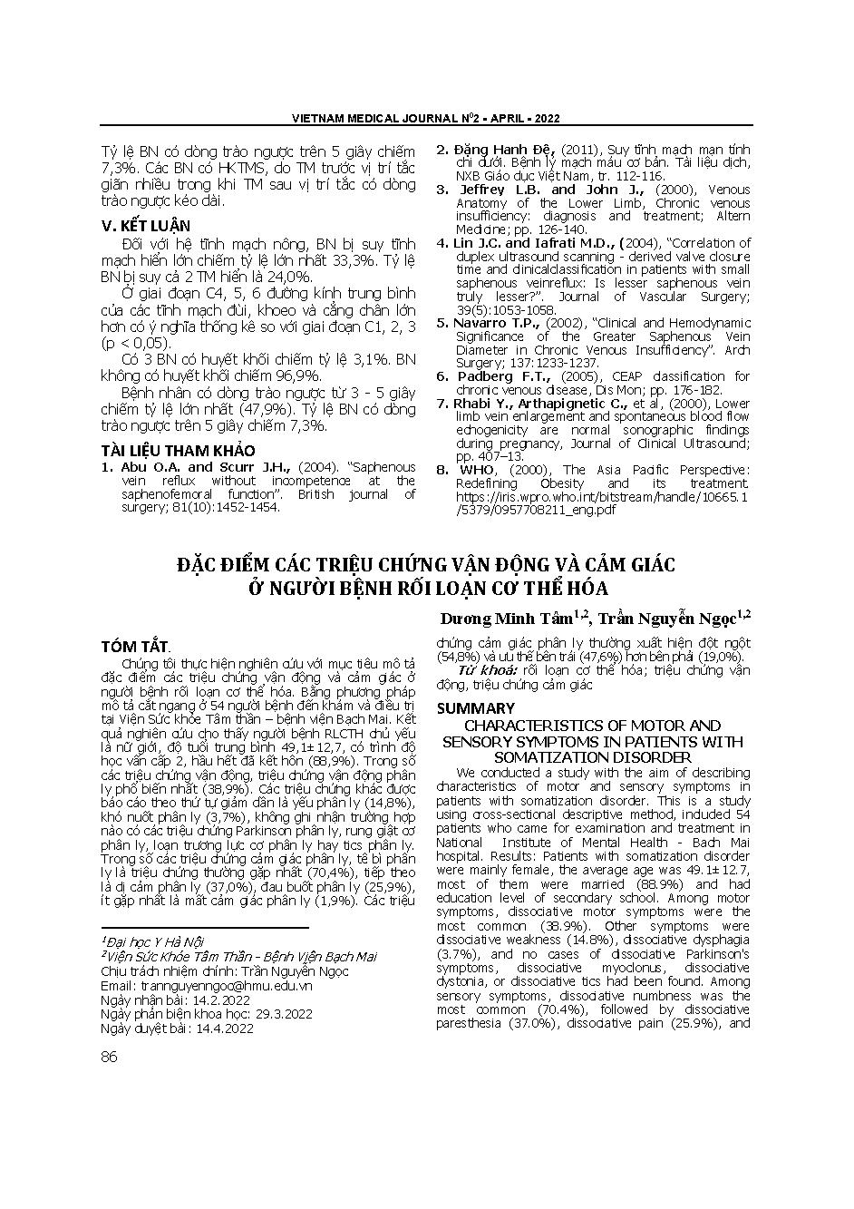 Đặc điểm các triệu chứng vận động và cảm giác ở người bệnh rối loạn cơ thể hóa = Characteristics of motor and sensory symptoms in patients with somatization disorder