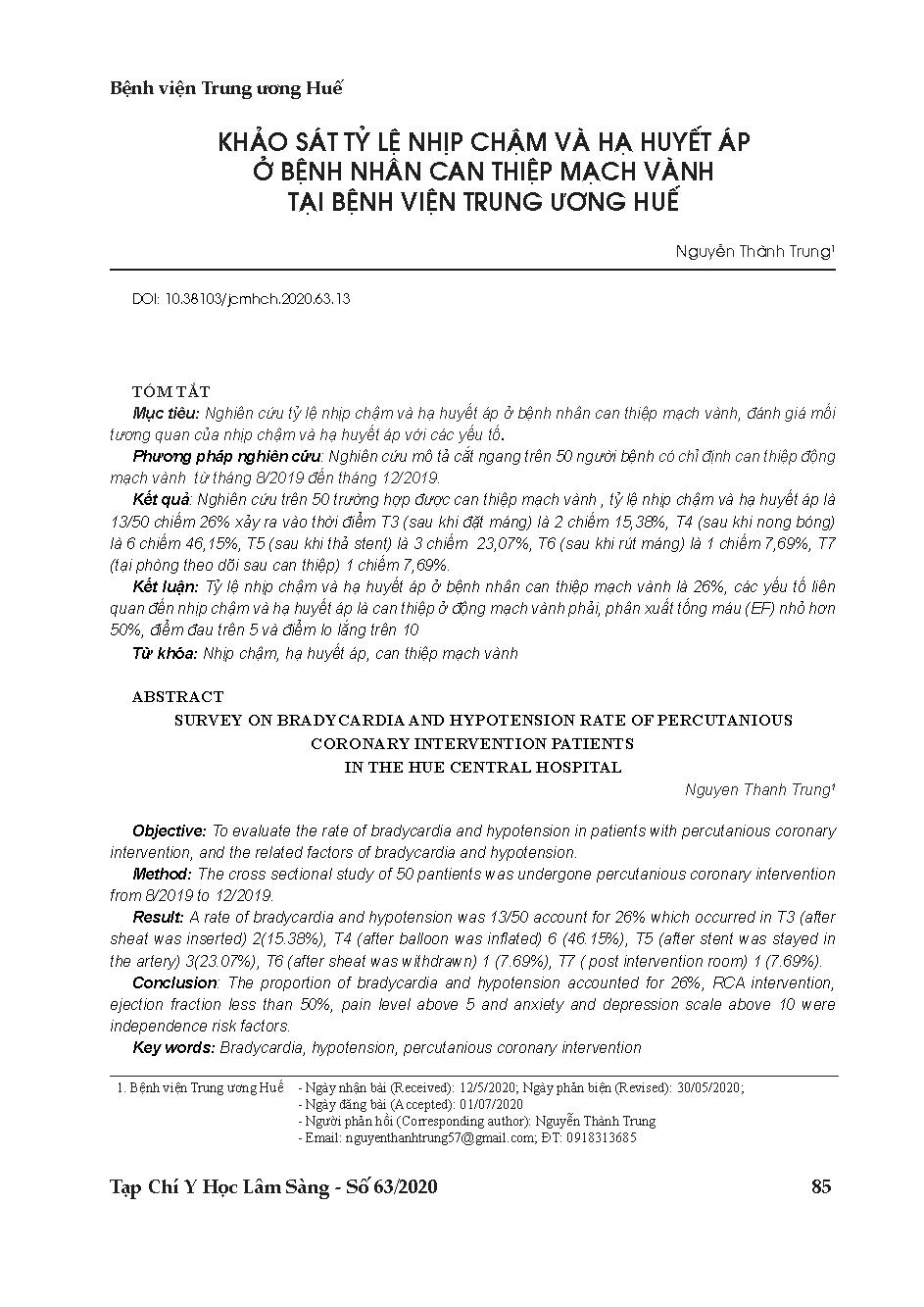 Khảo sát tỷ lệ nhịp chậm và hạ huyết áp ở bệnh nhân can thiệp mạch vành tại Bệnh viện Trung ương Huế = Survey on bradycardia and hypotension rate of percutaneous coronary intervention patients in the Hue central hospital