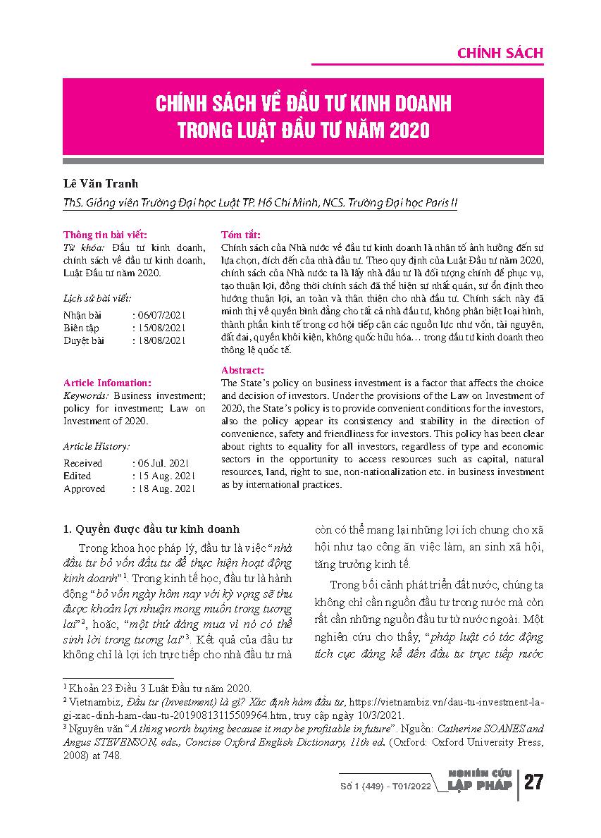 Chính sách về đầu tư kinh doanh trong luật đầu tư năm 2020 = Policy on business investment in the investment law in 2020