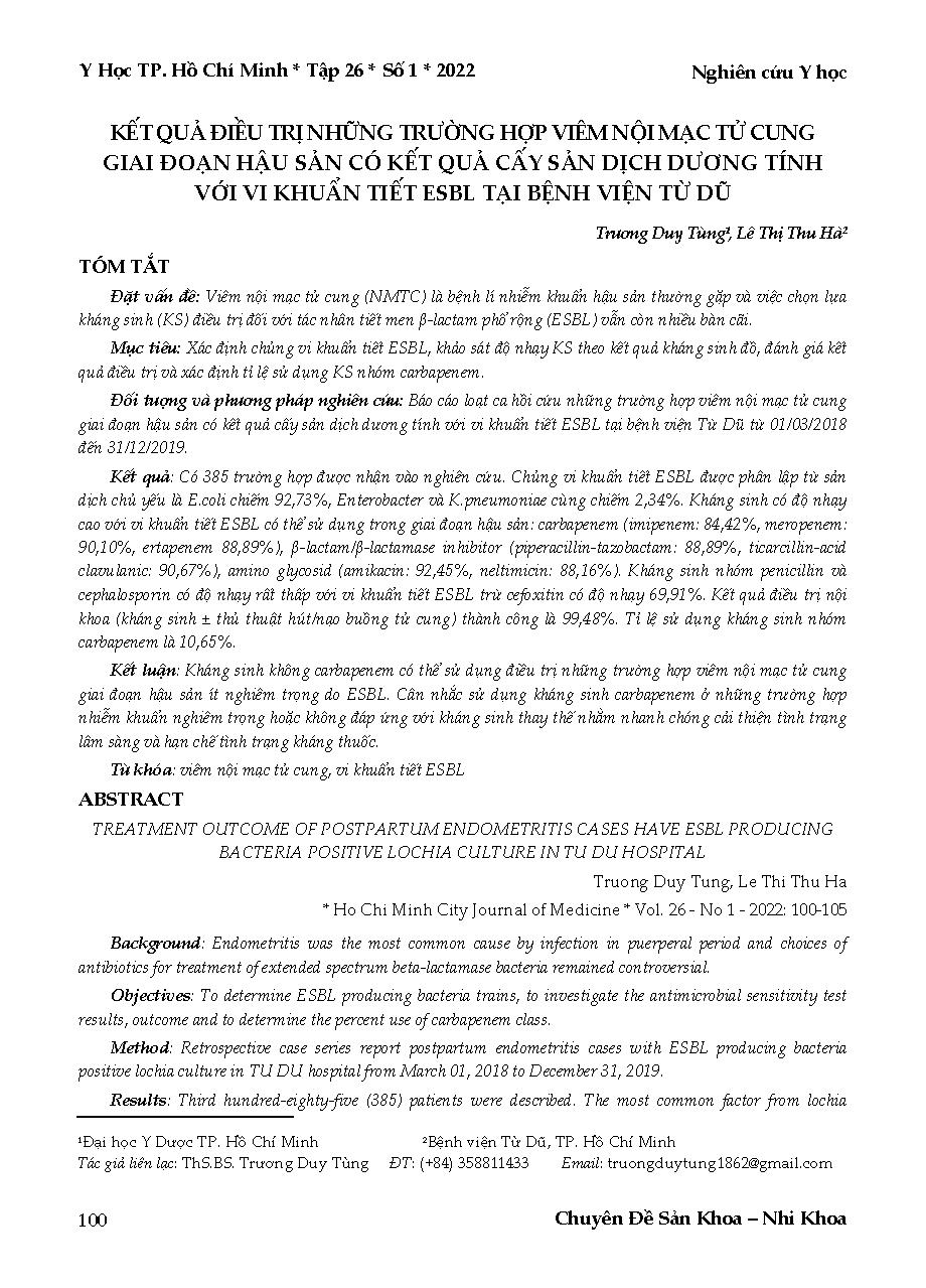 Kết quả điều trị những trường hợp viêm nội mạc tử cung giai đoạn hậu sản có kết quả cấy sản dịch dương tính với vi khuẩn tiết ESBL tại Bệnh viện Từ Dũ