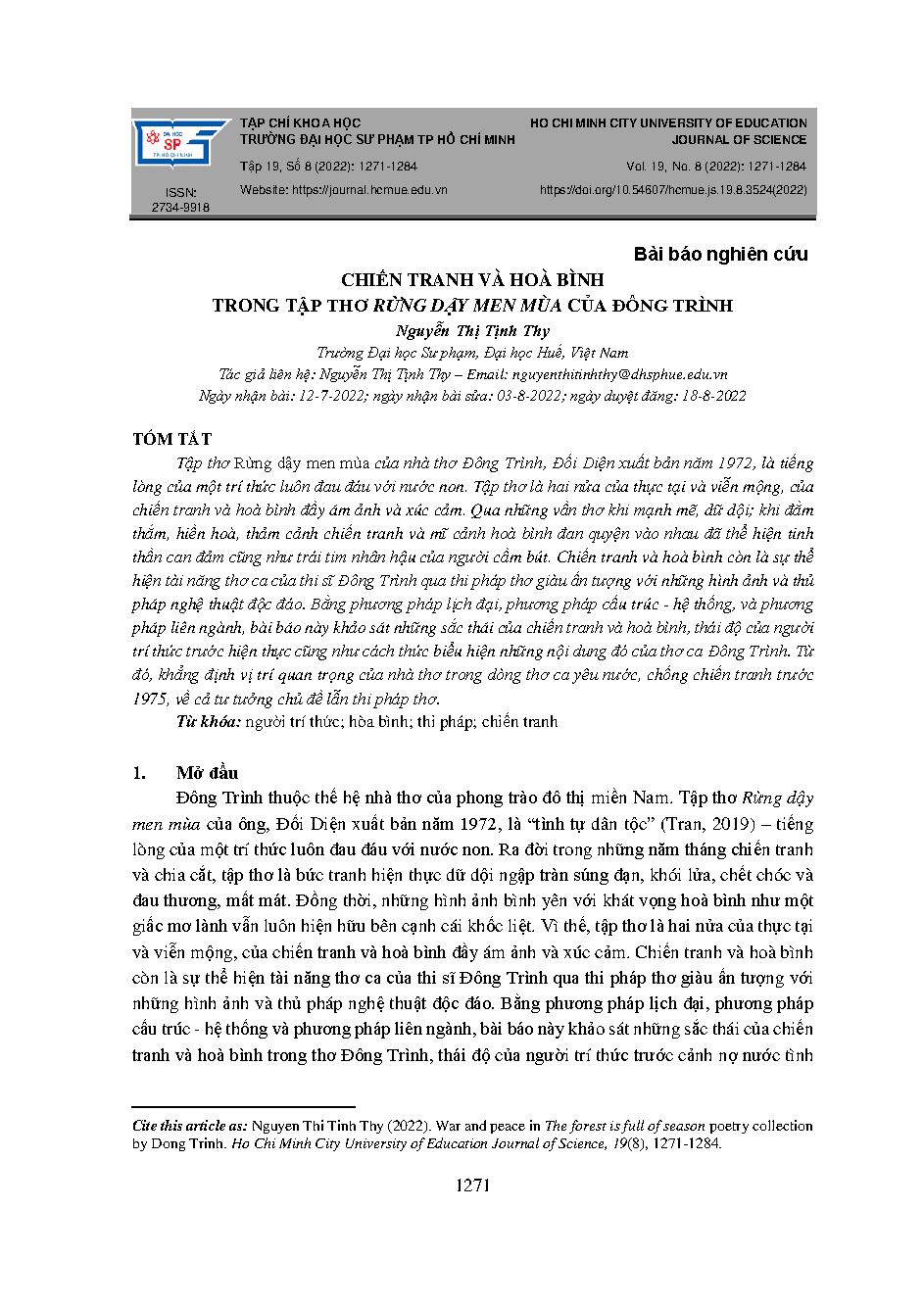 Chiến tranh và hoà bình trong tập thơ rừng dậy men mùa của Đông Trình = War and peace in the forest is full of season poetry collection by Dong Trinh