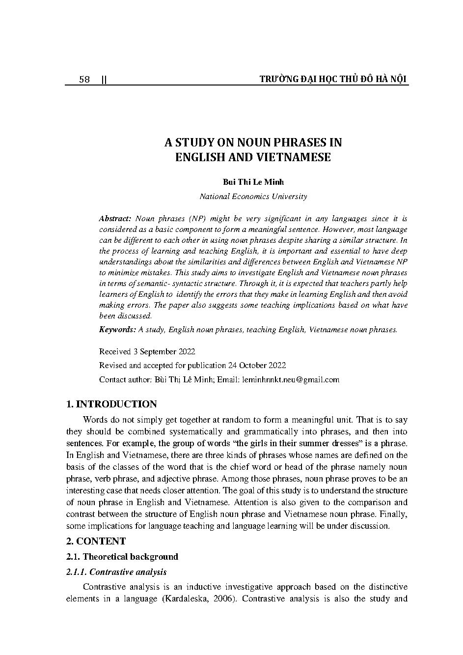 Một nghiên cứu về cụm danh từ trong tiếng Anh và tiếng Việt = A study on noun phrases in English and Vietnamese