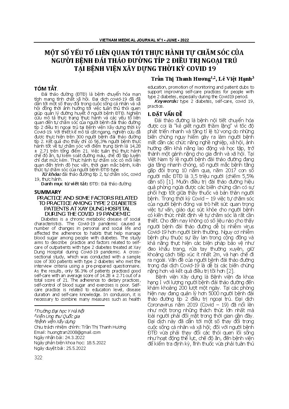 Một số yếu tố liên quan tới thực hành tự chăm sóc của người bệnh đái tháo đường tuýp 2 điều trị ngoại trú tại bệnh viện xây dựng thời kỳ Covid 19 = Practice and some factors related to practice among type 2 diabetes patients at Xay Dung hospital during th