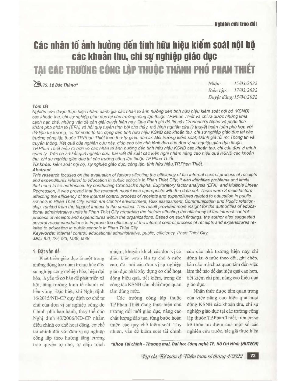Các nhân tố ảnh hưởng đến tính hữu hiệu kiểm soát nội bộ các khoản thu, chi sự nghiệp giáo dục tại các trường công lập thuộc thành phố Phan Thiết = Factors affecting the efficiency of the internal control process of receipts and expenditures related to ed