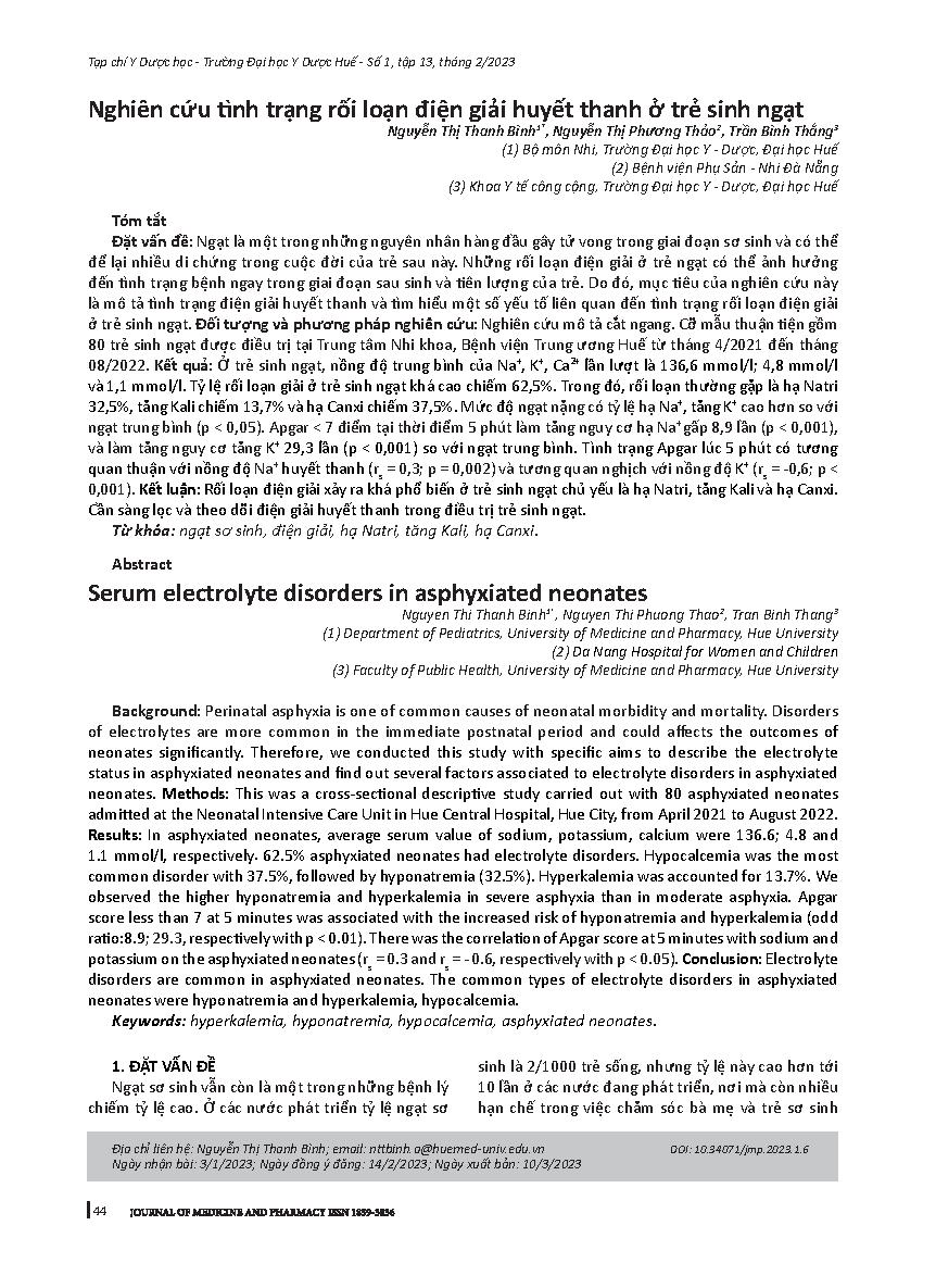 Nghiên cứu tình trạng rối loạn điện giải huyết thanh ở trẻ sinh ngạt = Serum electrolyte disorders in asphyxiated neonates