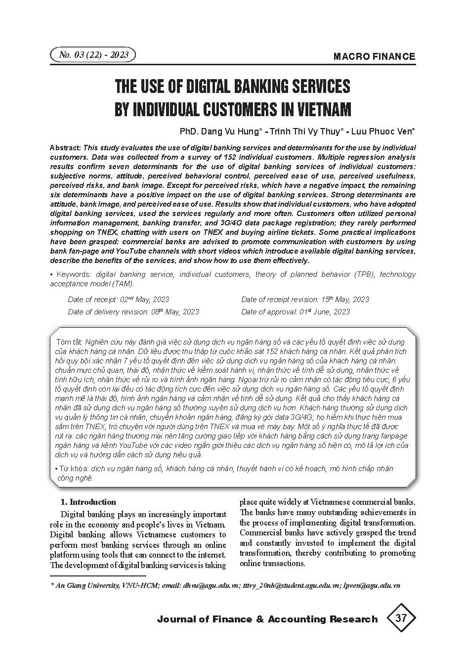 Việc sử dụng dịch vụ ngân hàng số của khách hàng cá nhân tại Việt Nam = The use of digital banking services by individual customers in Vietnam