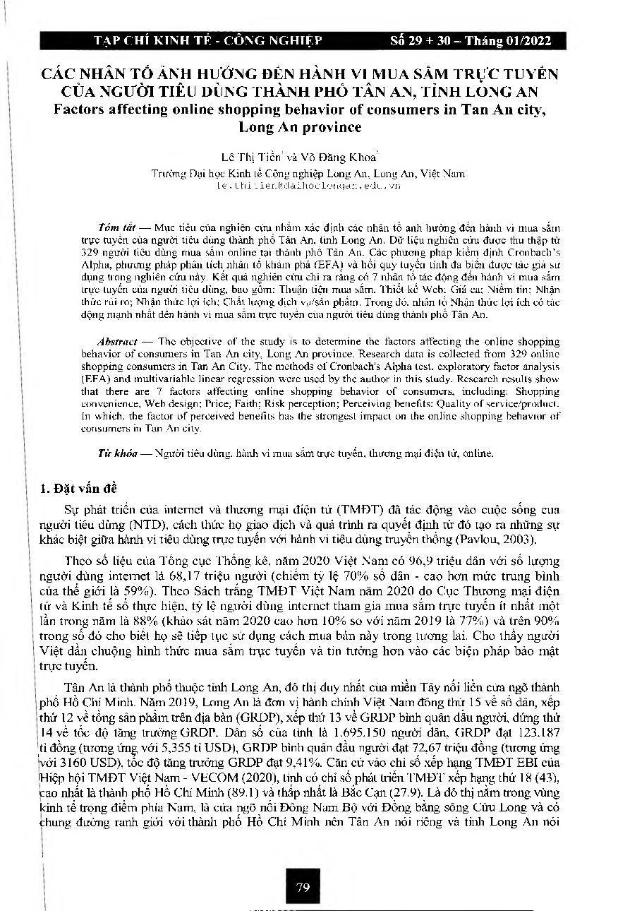 Các nhân tố ảnh hưởng đến hành vi mua sắm trực tuyến của người tiêu dùng thành phố Tân An, tỉnh Long An = Factors affecting online shopping behavior of consumers in Tan An city, Long An province