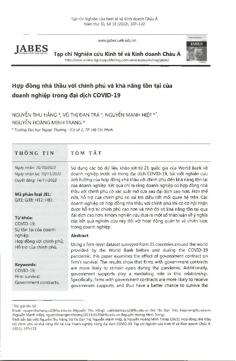 Hợp đồng nhà thầu với chính phủ và khả năng tồn tại của doanh nghiệp trong đại dịch COVID-19 = Government contractor contracts and business viability during the COVID-19 pandemic