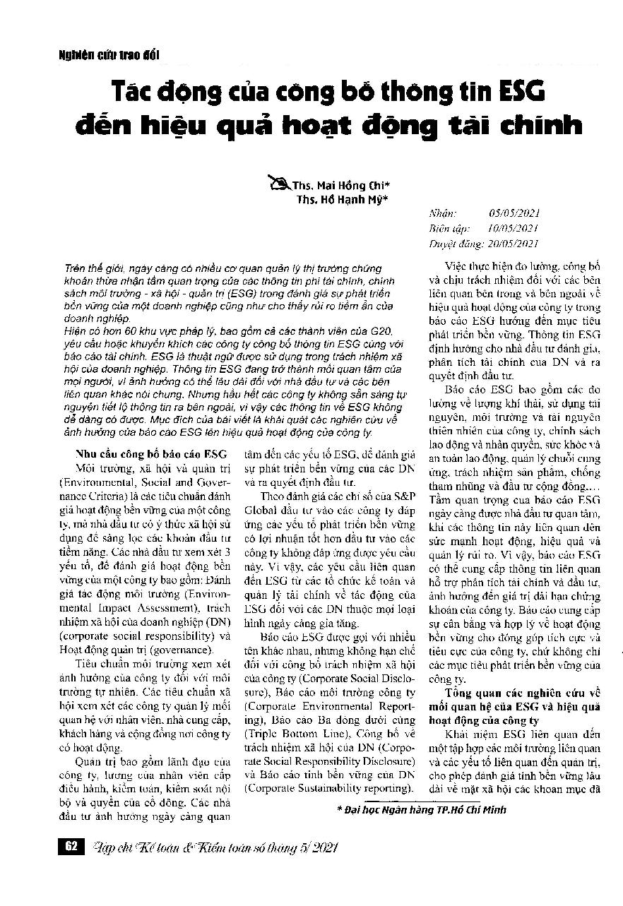 Tác động của công bố thông tin ESG đến hiệu quả hoạt động tài chính