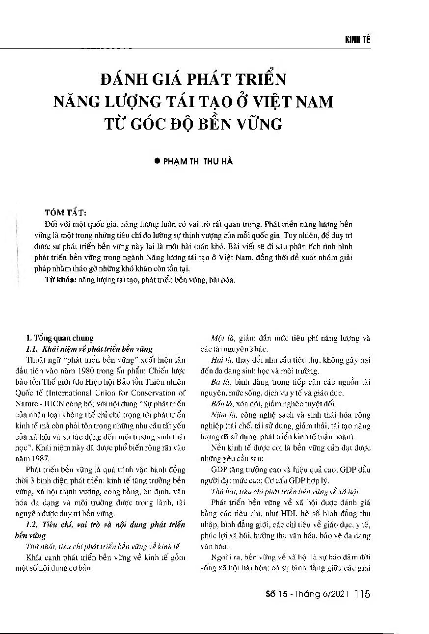 Đánh giá phát triển năng lượng tái tạo ở Việt Nam từ góc độ bền vững = Assessing the sustainable development situation of renewable energy industry in Vietnam