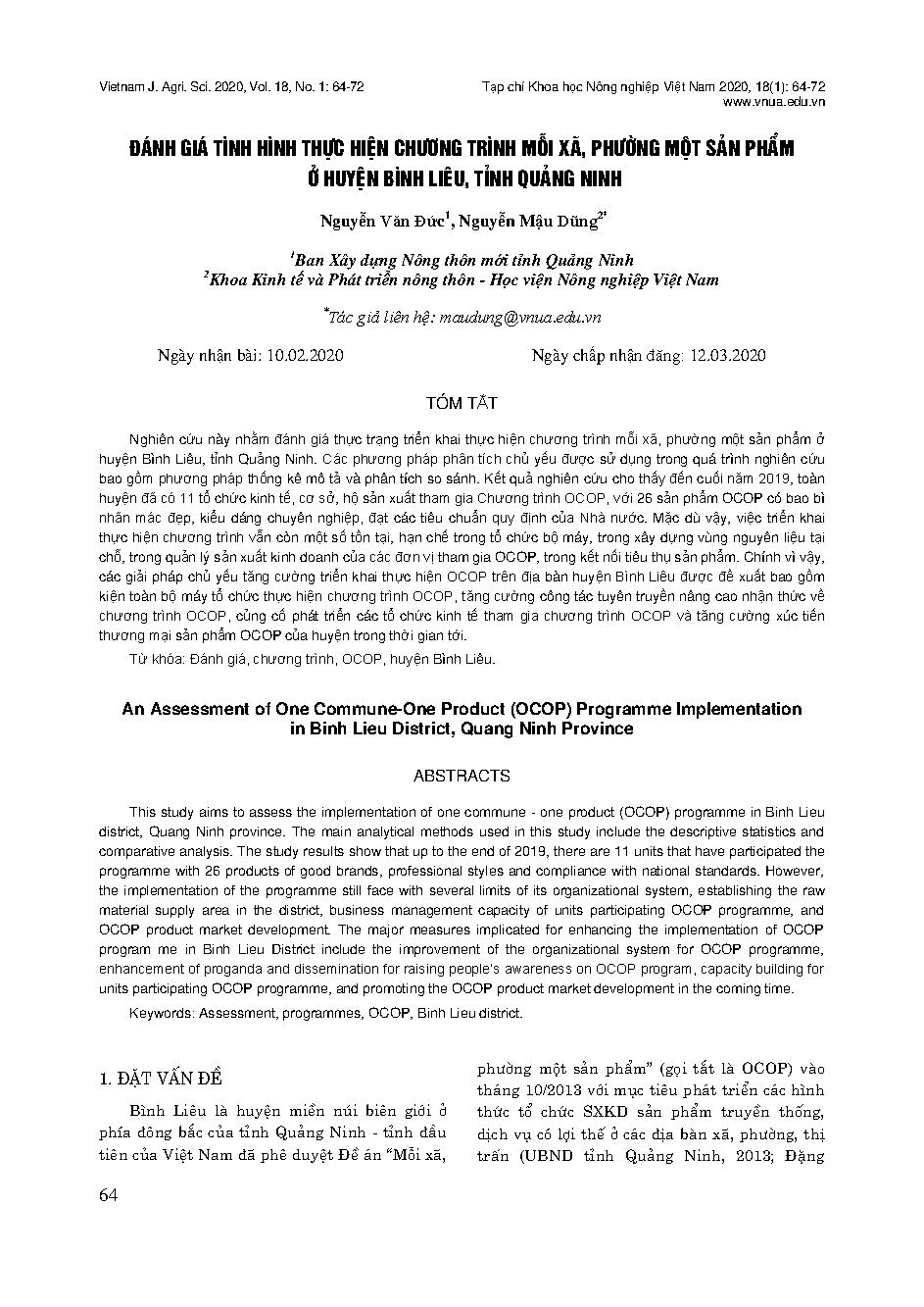 Đánh giá tình hình thực hiện chương trình mỗi xã, phường một sản phẩm ở huyện Bình Liêu, tỉnh Quảng Ninh = An Assessment of One Commune-One Product (OCOP) Programme Implementation in Binh Lieu District, Quang Ninh Province