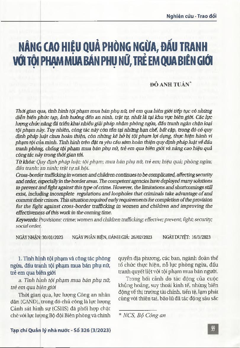 Nâng cao hiệu quả phòng ngừa, đấu tranh với tội phạm mua bán phụ nữ, trẻ em qua biên giới = Improving the effectiveness of the prevention and and combat of the cross-border trafficking of women and children