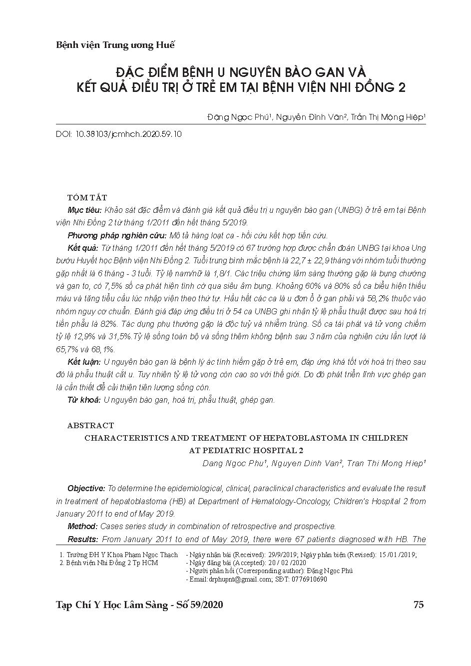 Đặc điểm bệnh u nguyên bào gan và kết quả điều trị ở trẻ em tại Bệnh viện Nhi Đồng 2 = Characteristics and treatment of hepatoblastoma in children at Pediatric hospital 2