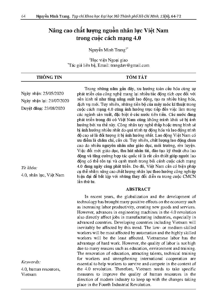 Nâng cao chất lượng nguồn nhân lực Việt Nam trong cuộc cách mạng 4.0 = Improve the quality of Vietnamese human resources in revolution 4.0
