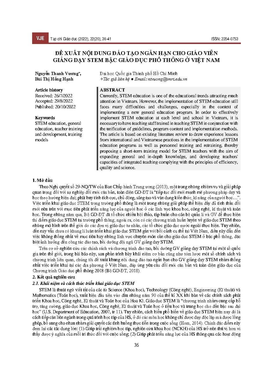 Đề xuất nội dung đào tạo ngắn hạn cho giáo viên giảng dạy stem bậc giáo dục phổ thông ở Việt Nam = Proposing short-term training content for stem teachers in general education in Vietnam