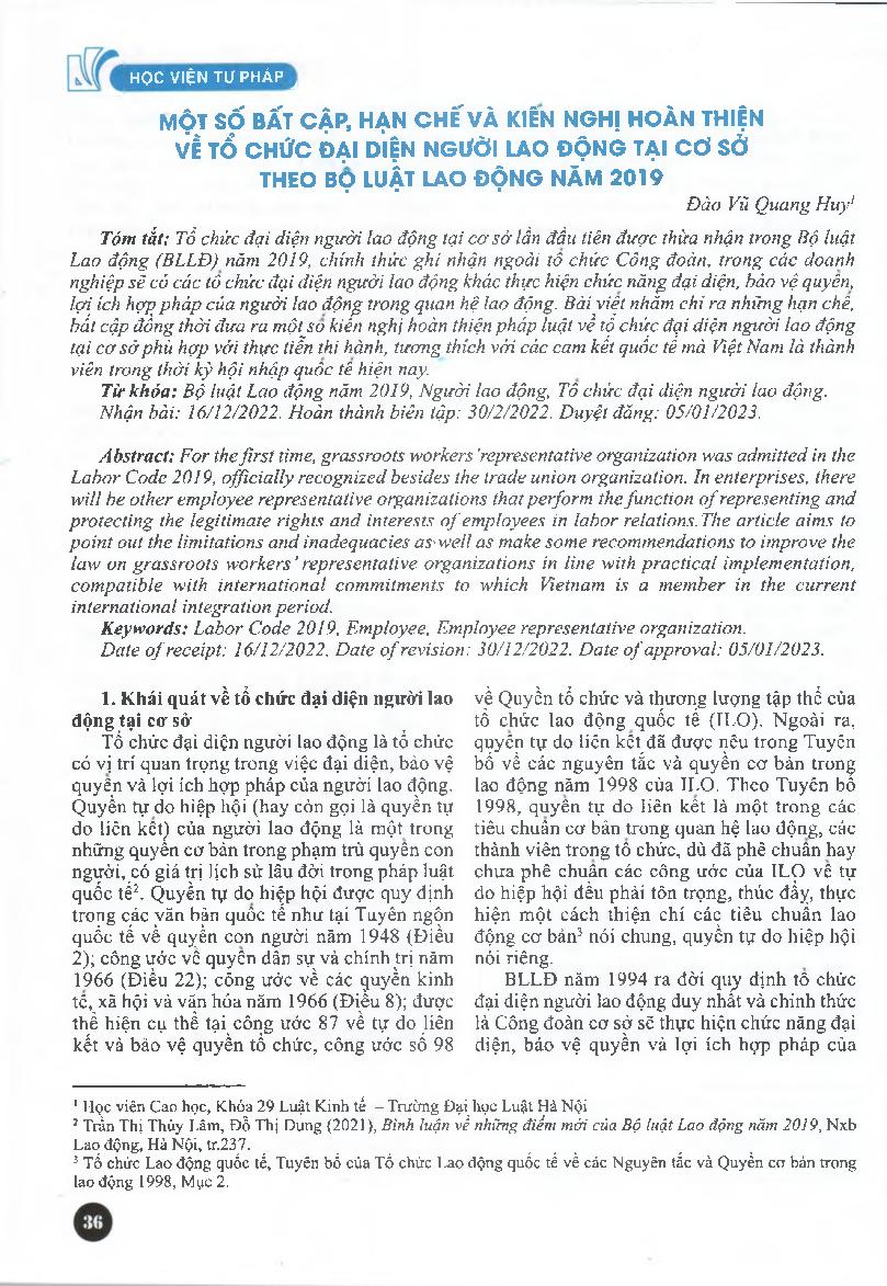 Một số bất cập, hạn chế và kiến nghị hoàn thiện về tổ chức đại diện người lao động tại cơ sở theo Bộ luật Lao động năm 2019 = Some shortcomings, limitations and recommendations to refine grassroots-level Employees' representative Organizations under the L