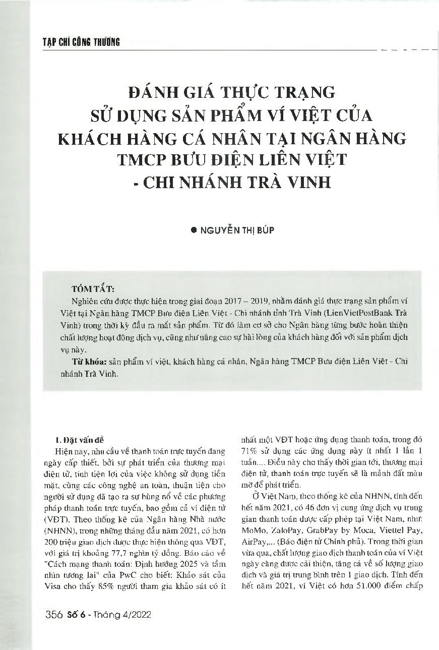 Đánh giá thực trạng sử dụng sản phẩm ví Việt của khách hàng cá nhân tại Ngân hàng TMCP Bưu điện Liên Việt - Chi nhánh Trà Vinh = Evaluating the use of Vietnam Wallet by individual customers of LienVietPostBank Tra Vinh