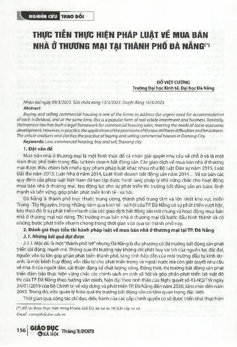 Thực tiễn thực hiện pháp luật vể mua bán nhà ở thương mại tại thành phố Đà Nẵng = Practical implementation of the law on commercial housing sale in Danang city.