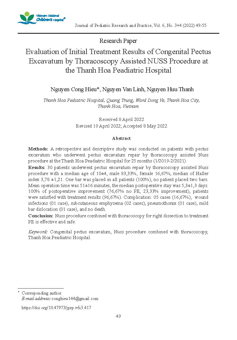 Đánh giá kết quả bước đầu điều trị lõm xương ức bẩm sinh bằng phẫu thuật NUSS kết hợp nội soi tại Bệnh viện Nhi Thanh Hóa = Evaluation of Initial Treatment Results of Congenital Pectus Excavatum by Thoracoscopy Assisted NUSS Procedure at the Thanh Hoa Pea